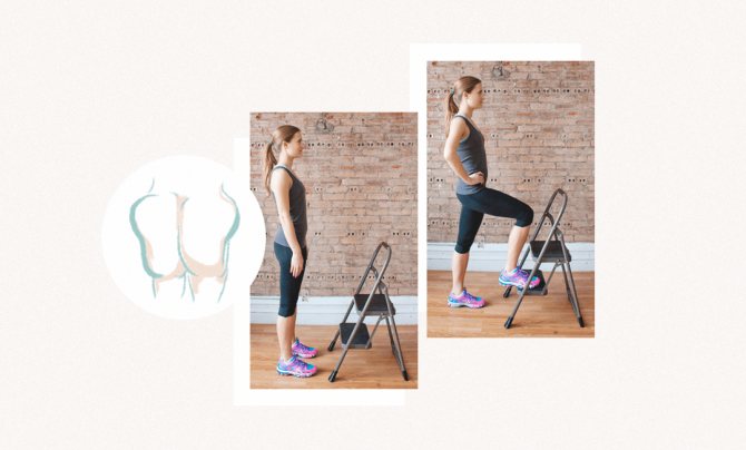 Встаньте перед платформой, разведите ноги на ширину плеч, а затем поднимайтесь на нее, сначала ставя левую ногу вперед, а затем подтягивая правую. Опускайтесь так же: сначала на одну ногу, в этот раз на правую, а затем опускайте левую. Повторите упражнение 10 раз, затем поменяйте очередность поднятия ног и повторите еще 10 раз. Сделайте по три захода на каждую ногу.