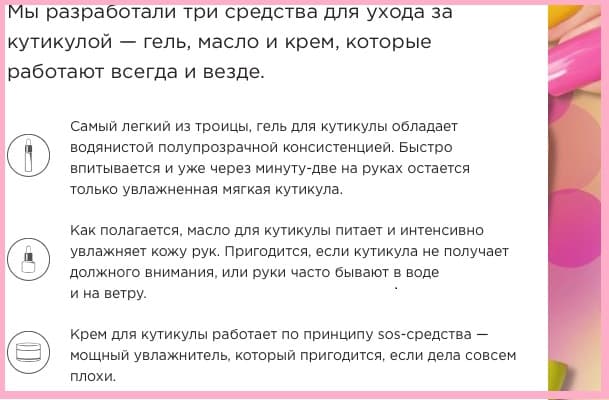 Производитель предлагает сразу несколько продуктов, предназначенных для ухода за кутикулами: