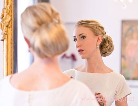- Платья с высокой закрытой горловиной или «американской» проймой требуют высокой прически. Из длинных волос в этом случае делают либо гладкий пучок-«ракушку», либо любой другой высокий пучок. Если ты носишь короткую стрижку, то лучше сделать акцент на лицевой части – уложить ассиметрично челку, завить обрамляющие лицо локоны, и т.д.