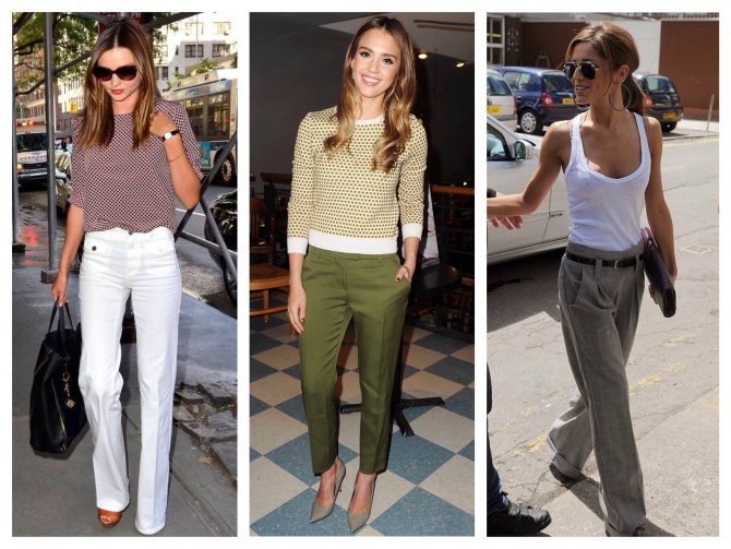 Самые подходящие для вас — со стрелками, прямые или клеш с середины бедра. Обратите внимание, чтобы самая широкая часть брюк не была шире ваших бедер, иначе это будет смотреться несуразно и неграмотно.